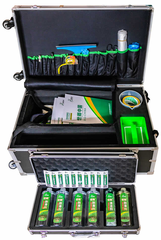 世卿防滑第四代打樣箱,榮耀問世,匠心制造,震撼來襲!!!首創(chuàng)防滑打樣干濕分離理念,開啟防滑防護(hù)項目施工新格局!第四代打樣箱,采用鋁合機身,360萬向輪,超大容量,合理布局,方便移動,經(jīng)典耐用!箱內(nèi)容納幾十件產(chǎn)品工具等,可滿足各種場所的現(xiàn)場打樣和百平米內(nèi)的防滑施工,打造專業(yè)創(chuàng)新,高端便捷的防滑施工體驗。